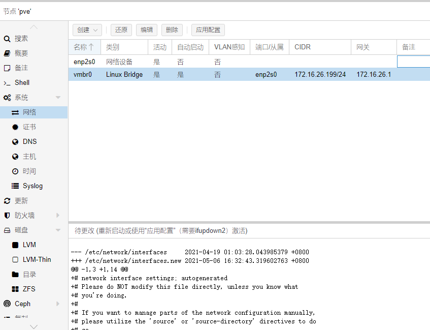 Proxmox VE 修改网络后,提示:待更改 (重新启动或使用“应用配置”(需要ifupdown2)激活)